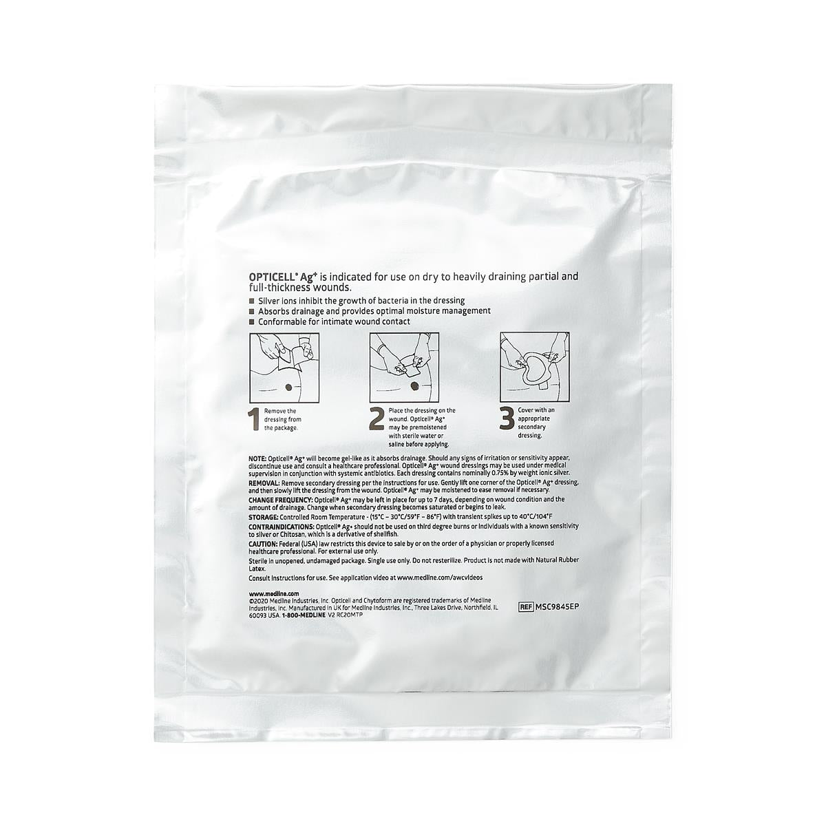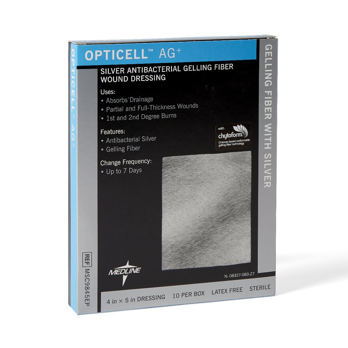 Opticell Ag+ Silver Antibacterial Gelling Fiber Wound Dressing, 4" x 5" inch Medline Sale! from $24.99 USD $36.49 USD /per Uom Each/1 Box/10 Produc variants Each/1 Box/10 Qty. Add to Cart This item is a recurring or deferred purchase. By continuing, I agree to the cancellation policy and authorize you to charge my payment method at the prices, frequency and dates listed on this page until my order is fulfilled or I cancel, if permitted. Couldn't load pickup availability Refresh Tweet This item is currently on backorder but you can still purchase it now and we'll ship as soon as more become available. Features & Benefits Chitosan-based Chytoform technology transforms the absorbent fibers of the dressing into a clear and conformable gel Gelling action helps manage drainage and remove exudate from wounds, trapping it for removal at the dressing change Ionic silver provides broad-spectrum antibacterial protection Up to a 7-day wear time Ideal for partial- and full-thickness wounds of all drainage levels UOM: 1 EACH/ 10 PER BOX Item Specs Adhesive- No Antimicrobial - Yes Applications and Size - 4 x 5 Area Of Application - Wound Brand - Opticell Ag Ribbon Brand Description - Opticell Ag+ Gelling Fiber Category - Primary Dressing Dressing Change Frequency/Use - Up to 7 Days Dressing Type - Gelling Fiber Length Inches - 4 " Primary or Secondary Dressing - Primary Product Category - Gelling Fiber Product Type - Silver Gelling Fiber Dressing Secondary Dressing - Recommended Sub-Category - Silver Fiber Sheet Width Inches - 5 " Wound Condition Type - Moderate To Heavy Drainage FSA/HSA Eligible - Yes Manufacturer - MSC9845EPH (Each), MSC9845EPZ (Box) HCPCS Code - A6197 Manufacturer - Medline