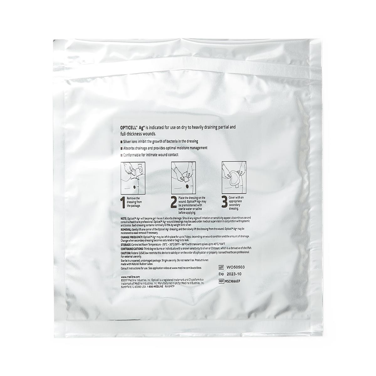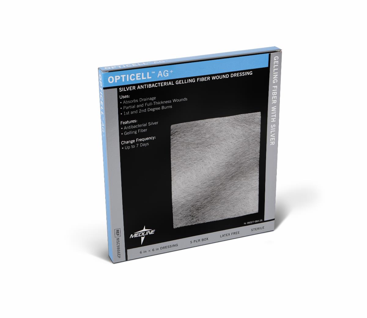 Opticell Ag+ Silver Antibacterial Gelling Fiber Wound Dressing, 6" x 6" inch Medline Sale! from $39.99 USD $52.65 USD /per Uom Each/1 Box/5 Produc variants Each/1 Box/5 Qty. Add to Cart This item is a recurring or deferred purchase. By continuing, I agree to the cancellation policy and authorize you to charge my payment method at the prices, frequency and dates listed on this page until my order is fulfilled or I cancel, if permitted. Couldn't load pickup availability Refresh Tweet This item is currently on backorder but you can still purchase it now and we'll ship as soon as more become available. Features & Benefits Chitosan-based Chytoform technology transforms the absorbent fibers of the dressing into a clear and conformable gel Gelling action helps manage drainage and remove exudate from wounds, trapping it for removal at the dressing change Ionic silver provides broad-spectrum antibacterial protection Up to a 7-day wear time Ideal for partial- and full-thickness wounds of all drainage levels UOM: 1 EACH/ 5 PER BOX Item Specs Adhesive- No Antimicrobial - Yes Applications and Size - 6 X 6 Area Of Application - Wound Brand - Opticell Ag Sheet Brand Description - Opticell Ag+ Gelling Fiber Category - Primary Dressing Dressing Change Frequency/Use - Up to 7 Days Dressing Type - Gelling Fiber Length Inches - 6 " Primary or Secondary Dressing - Primary Product Category - Silver Dressings Product Type - Silver Gelling Fiber Dressing Secondary Dressing - Recommended Sub-Category - Silver Fiber Sheet Width Inches - 6 " Wound Condition Type - Moderate To Heavy Drainage FSA/HSA Eligible - Yes Manufacturer - MSC9866EPH (Each), MSC9866EPZ (Box) HCPCS Code - A6197 Manufacturer - Medline