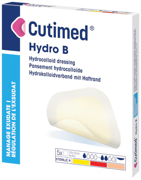 is a bordered, sterile, hydrocolloid dressing designed to maintain a moist wound environment. The dressing material interacts with the wound exudate to form a soft gel. Cutimed® Hydro B is a dressing with a tapered edge and a thicker core and has stronger liquid absorption capacity than Cutimed® Hydro L.