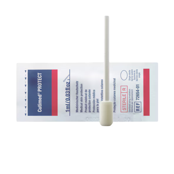 Cutimed® PROTECT Foam Applicator is a skin protectant with a foam sponge applicator. A polymeric solution that forms an even film when applied to the skin. It forms a durable, waterproof barrier film, protecting the skin from adhesives, shearing forces, bodily waste, and digestive and wound fluids. For use on intact or irritated skin.