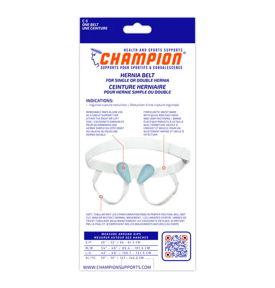 The Champion C-5 hernia belt is lightweight and very comfortable to wear. It is designed to maintain an inguinal hernia or rupture in reduction and can be worn with both adjustable pads for a bilateral hernia or with either pad removed for a single hernia.