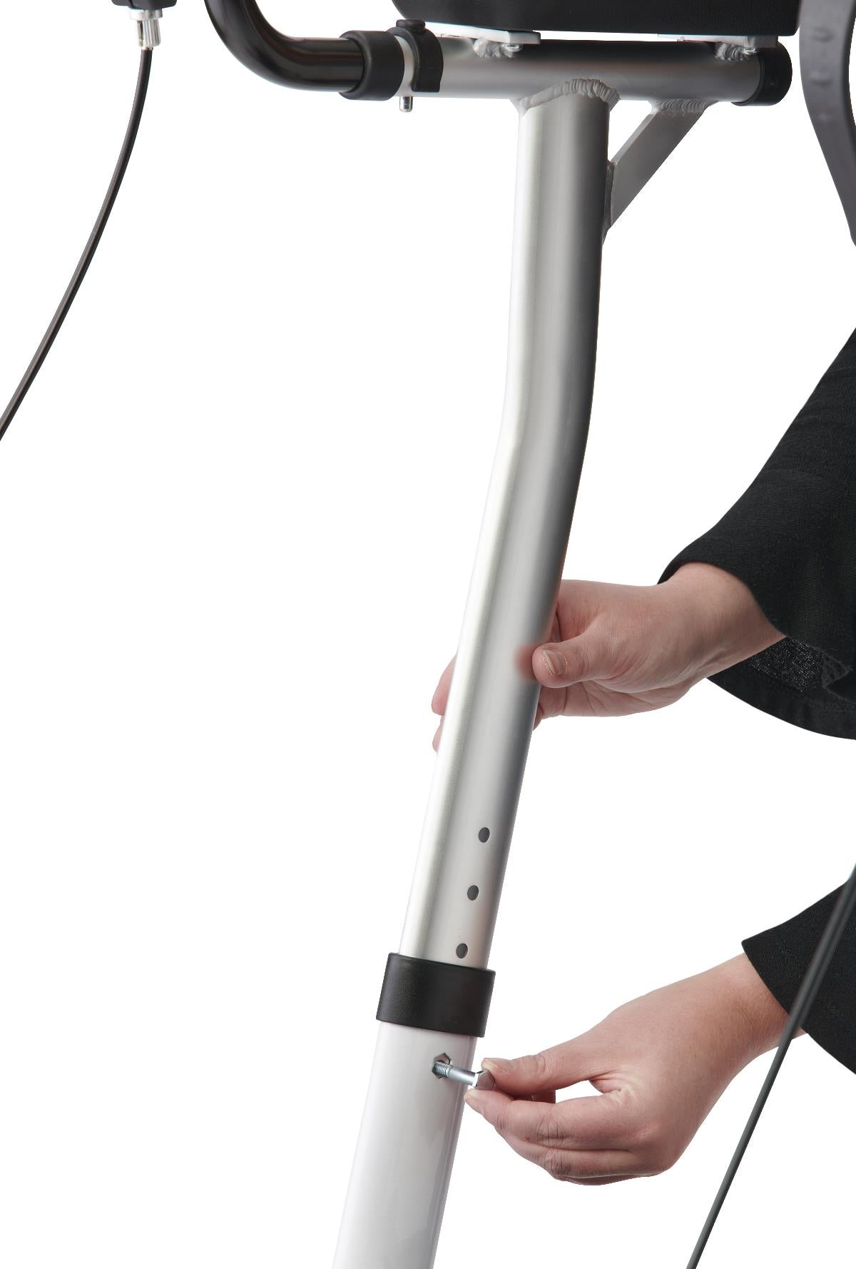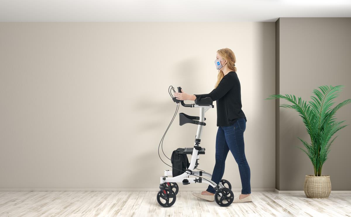 • European-style upright rollator with white aluminum frame