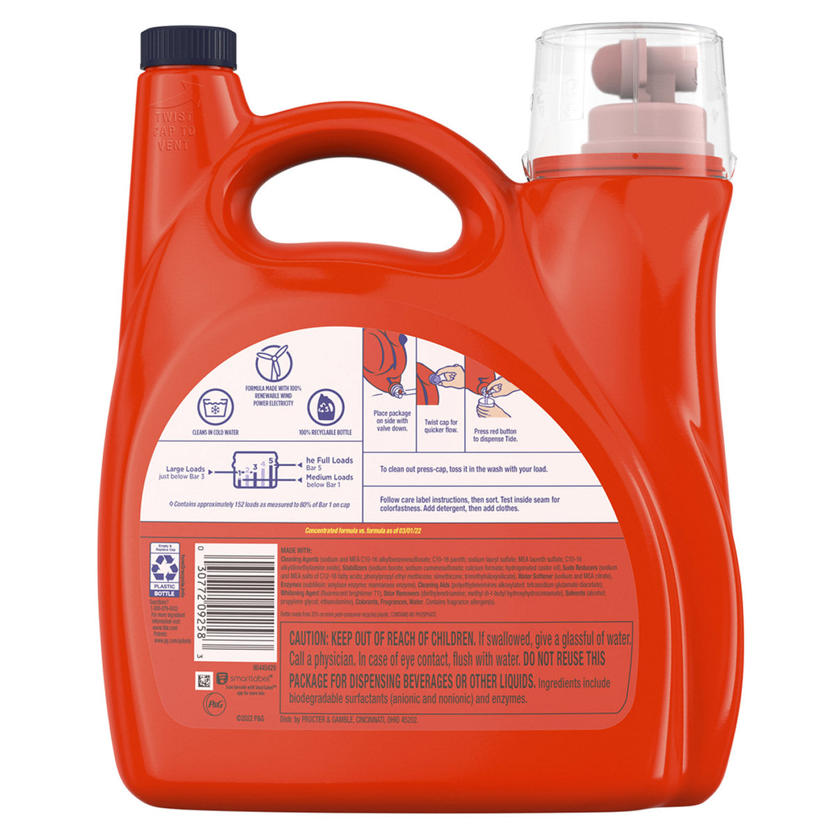 Face it, the world can be a really dirty place. Coffee mugs get jostled, flowerbeds get weeded, and home plates get slidden into. In a world where common stains can be mere moments away, you need a clean that can stand up to them. When it comes to an effective stain remover for your clothes, you know the solution is the one that you can trust in any circumstance. Tide Liquid Laundry Detergent will give you the Tide clean you love - every single time.A surprisingly powerful clean in one step—even in cold water. Tide Liquid Laundry Detergent works on 100% of common stains, including grease stains, giving you the clean and freshness you know and love in any water condition. When it comes to choosing a laundry detergent that works on all of life’s messes, don’t pay for water, get 2X cleaning ingredients.*